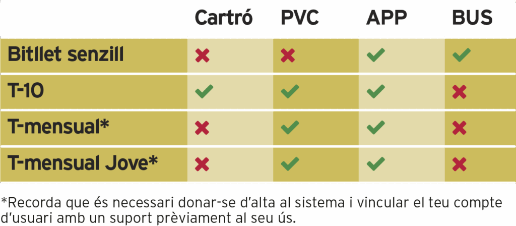 Els suports PVC i mòbil (app TUS) permeten carregar diferents títols simultàniament (per exemple, una T-mensual i una T-10…) o bé un major nombre de títols (per exemple dos T-mensual joves, o tres T-10…).